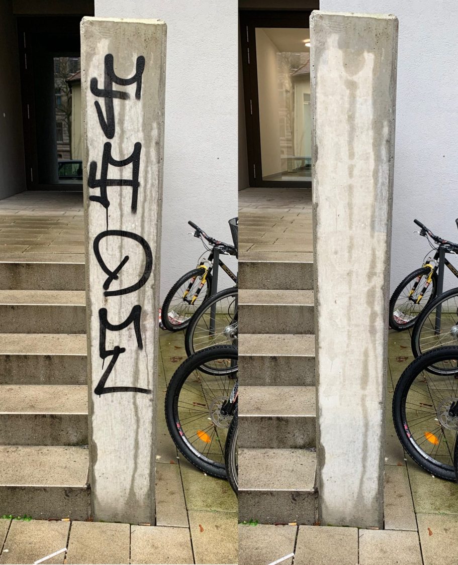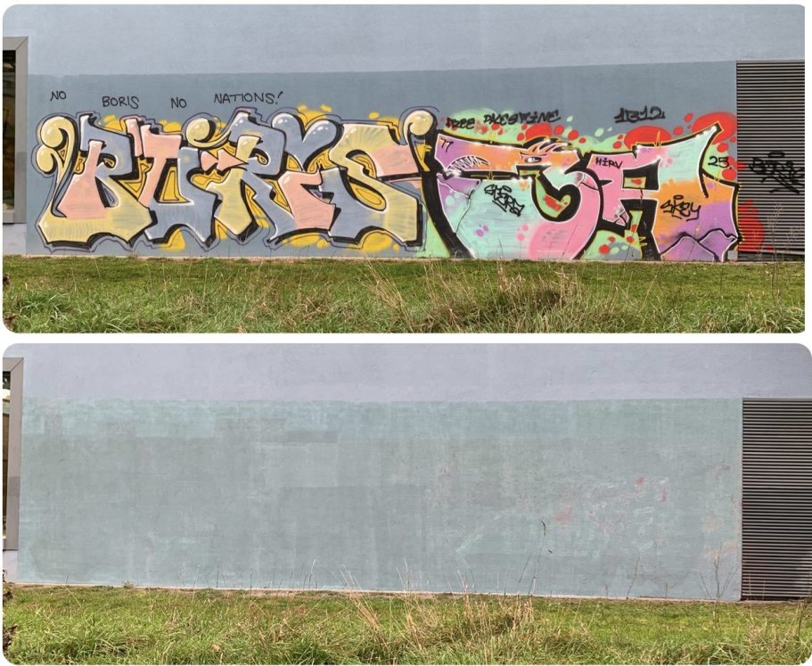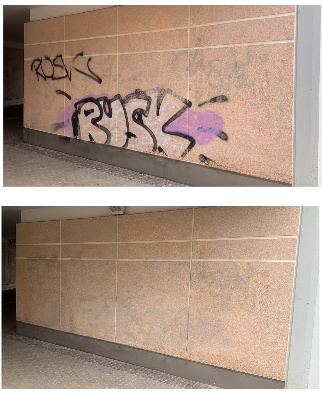 Im Gegensatz zu anderen Methoden zur Graffiti-Entfernung, die schädliche Chemikalien oder abrasive Medien hinterlassen, erzeugt die Laserreinigung keinen Abfall, der danach entfernt werden muss.